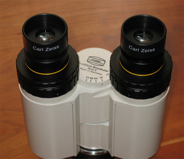 Right: the business end of the Baader Mark V Binocular Head shown here with optional Carl Zeiss Abbe Orthoscopic 16mm eyepieces (86,195 bytes). Origin of the Mark V The binocular viewer which the Baader Mark V improves upon was one of the few which were engineered for astronomy from the ground up; most other prior models having been adapted from microscopes and those were not all that successful. The Mark V system was engineered and first manufactured entirely in house by the most capable optics house in the world under their trade mark Carl Zeiss of Germany; one can see one of these in the museum collection of Company Seven's showroom. Since the reunification of East and West Germany, the 1990's brought about some reorganization at Carl Zeiss and the production of amateur oriented telescopes was suspended. Baader Planetarium of Mammendorf, Germany arranged to buy the castings used by Zeiss, then contract Zeiss to make the optics in what would be basically the same Baader Binocular Viewer. In the USA this prior model and its current successor described herein are sold by and Astro-Physics and by their only full line retailer Company Seven. Standard features of the Baader Binocular Head still include: