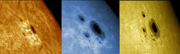 Above Right: imaging the same Sunspot through DayStar filters: Hydrogen Alpha, Calcium K Line, and Sodium D Line (137,379 bytes).