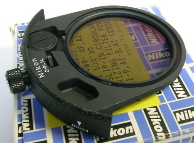 Left: Optional Nikon C-PL1L Circular Polarizing Filter, as see from the quarter and rear perspectives. The drop-in filter holder could accommodate a polarizing filter however, the only way to adjust the orientation of the filter to the target is to loosen the Nikkors Mounting Collar and rotate the lens. Unfortunately this causes not only the lens but also the Nikon camera at the rear to rotate and may put the camera in some unfavorable orientation to compose the photo. Years after the 300mm f/2 ED IF were discontinued Nikon introduced the C-PLxL series of drop-in filter holders, a valuable optional accessory for anyone taking pictures out doors. Each one includes a thread-on Nikon Circular Polarizing Filter. The holder incorporates a geared mechanism so that even when the filter is installed into the lens the photographer can rotate the filter to any desired orientation, as much as 360 degrees. A circular polarizing filter is the preferred choice whenever using most modern cameras that employ a through-the-lens (TTL) center-weighted metering system. But note the use of multi-sensor metering camera may result in incorrect exposure. There are several variants of these filter holder sets produced by Nikon however, the only model that properly fits the 300mm f/2 ED IF lens is the Nikon C-PL1L (Part No. 2474). One last caution the C-PL1L filter holder is not resistant to dust or dirt, and are not waterproof.
