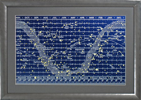 Right: Questar Star Chart as provided with the 50th Anniversary Model telescope. The Star Chart pictured here is framed and on display as part of Company Seven's showroom museum collection - absolutely stunning (185,386 bytes). The charts are provided as a standard feature of each new Questar 3-½ astronomical telescope. The charts are made from a precise flat aluminum stock that is anodized and then printed with the chart pattern. Then this flat map (an example is shown at right) is precisely rolled into a final cylindrical form and affixed into place. The Moon Map is installed onto the barrel of the telescope optical tube, while the Star Chart is permanently attached on the slip-on Dew Shield. The Star Chart and Moon Map are provided on every Questar Standard 3-½ made since 1954. Scaled down charts are provided on the Questar Duplex instruments made since the late 1980's, this having been an option added beforehand and optionally deleted on current production Duplex. The charts provided on the Duplex telescope must be scaled down since the Duplex optical tube assembly Mounting Collar takes up some of the otherwise available length of the barrel. In the fall of 2002 scaled up versions of the charts became available as options for the Questar 7 telescopes barrel; the new owner reversed the historic arrangement in that the barrel incorporates the Star Chart with the Dew Shield covered by the Moon Map. The charts provided with the telescopes are silk-screened onto a smooth anodized aluminum surface. The Star chart provided with the Questar 50th Anniversary Model are made in the manner in which these charts were originally produced from 1954 and into the 1960's, this is with the surface embossed then anodized and inlay painted so that each feature has a palpable depth; this is a tedious and costly process made more complicated by the fact that fewer and fewer US based manufacturers exist with the skill and interest to do this work for Questar. As explained by Lawrence Braymer, founder and designer of the Questar: over this a rotatable perpetual star char is etched in silver on ultramarine anodized aluminum, thus merging the 18th century compound reflector, companion of kings and men of means and culture, with the celestial globe in Mercator projection..."