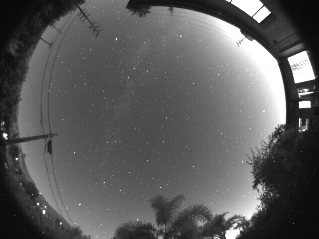 The All Sky camera incorporates the Smart Guider Camera inside an aluminum enclosure with an acrylic dome to protect the fisheye lens. The fisheye lens is Fujinon's new FE185C046HA-1, with a 1.4 mm focal length, F/1.4. We have tested this lens and the image quality is excellent wide open, all the way to the horizon. Figure One below shows an All Sky camera image with the Fujinon lens and KAI-340 CCD. The exposure was 60 seconds from a light polluted backyard – the first quarter moon had just set behind the roof.