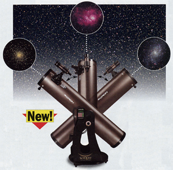 ONE GIANT LEAP FOR DOB-KIND - EVOLVING NOVEMBER 2003! The Orion SkyQuest Dobsonian telescopes are designed for beginners who seek the best possible view of the faint Deep Sky objects while on a constrained budget. These telescope benefit from years of study and refinement of those Dobsonian style telescopes already on the market; they include advanced design and materials to keep them lightweight and simple to use. Furthermore, the accessories included are common sense items to insure a good first night out; these are items that would normally be optional for competing telescopes. Our simple to use Orion SkyQuest XT8 and XT10 telescopes always provided their owners with more bang for the buck for the dollar. And these are each backed by Orion and Company Seven - two of the most credible and competent sources of telescopes in the marketplace. While the SkyQuest series telescopes continued their dominance over all other economical Dobsonians worldwide by virtue of their dazzling optics and superior engineering, for 2003 we add a new contemporary lightweight base design and most exciting of all, the ability to locate any of more than 14,000 fascinating celestial objects with a nudge and some pushbutton ease! Right: Orion SkyQuest XT10 IntelliScope telescope with standard 9x 50mm Finder, 2" Focuser, Navigation Knob, 2" and 1.25" Eyepiece Holder, four vane thin profile Secondary Mirror Spider. Note the IntelliScope Control shown here is optional (51,107 Bytes). Click on image to see enlarged view (85,940 bytes)