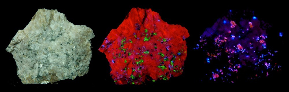 When some materials (fabrics, minerals, biological) are bathed in ultraviolet light then they fluoresce or phosphoresce, appearing to glow - giving off light and usually doing so in colors that will surprise and amaze the observer. The intensity of the returning visible color(s) from the sample depends on: