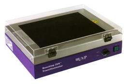 With convenient grab handles at either end of each plate, simply place the appropriately sized plate over the emitting panel to increase the versatility of your UVP Transilluminator. The patent pending phosphored glass is stimulated by ultraviolet radiation from the Transilluminator and this fluoresces emitting the desired resulting light.